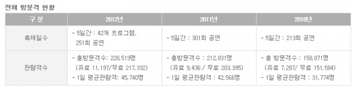 2012 전주세계소리축제 관람객 증가율 & 유료공연 좌석 점유율 & 유료공연 매진율