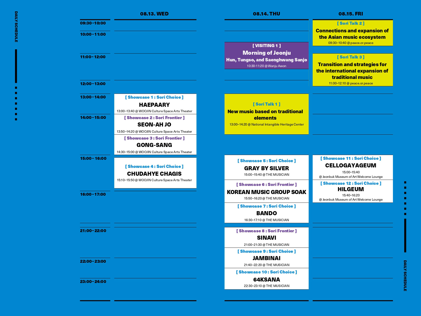The Jeonju Int’l Sori Festival, selected as a festival for the <2025 Genre-Specific Market Hub Support Project by the Arts Management Service>, launches “SORI NEXT” in order to expand the festival’s scope by including a market and to take a new role and responsibility as a distribution platform. “SORI NEXT” is a platform that supports the entry of traditional music-based arts organizations into domestic and international markets and promotes the distribution of their works and collaborations. This is an experimental attempt to create a sustainable ecosystem within the performing arts distribution market, showcasing artists who possess artistic excellence, market potential, and growth probability. “SORI NEXT” will serve as a venue for artists and experts to explore new possibilities of collaborative production and cooperation, and as a meaningful space connecting the present and future of traditional music.