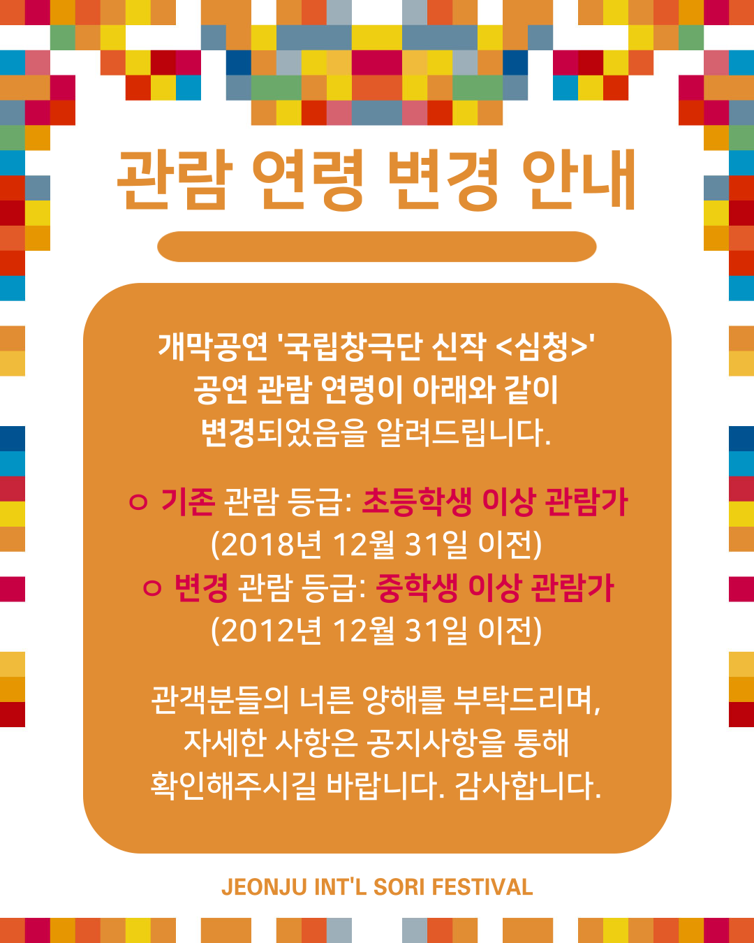 개막공연 ‘국립창극단 신작 <심청>’ 관람 연령 변경 안내
