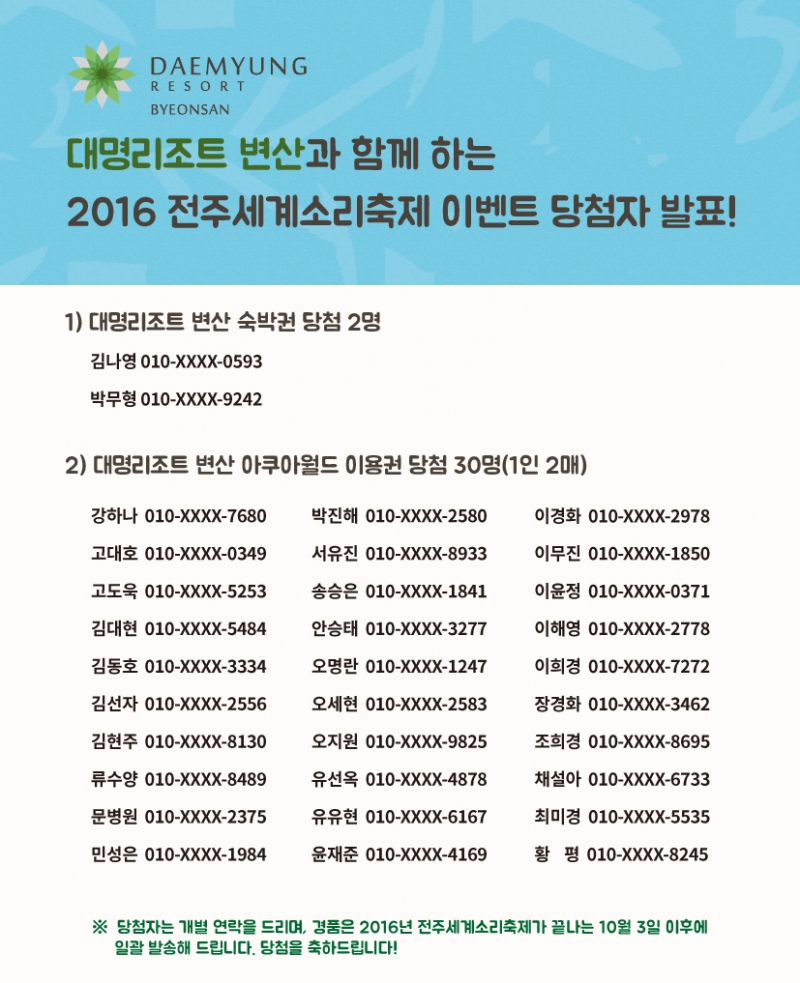 대명리조트 변산과 함께하는 2016 전주세계소리축제 이벤트 당첨자 발표!