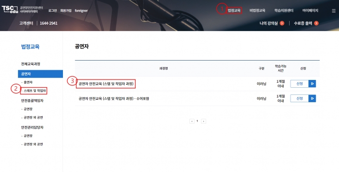 1. 법정교육→ 공연자-스태프 및 작업자→ 공연자 안전교육(스탭 및 작업자 과정) 수강신청 → 학습