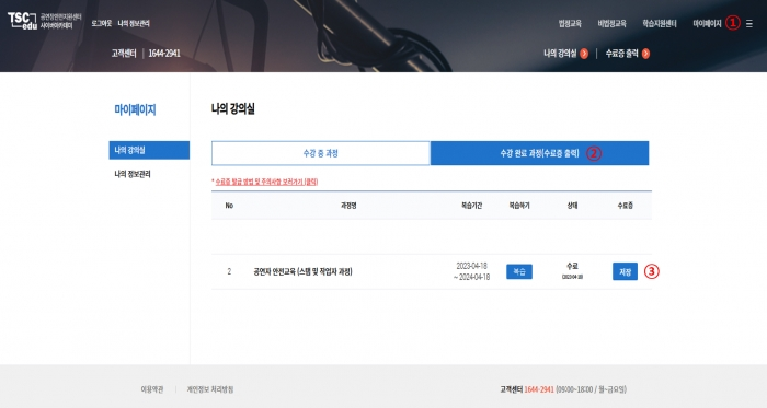 2. 마이페이지→수강 완료 과정(수료증 출력)→수료증 저장